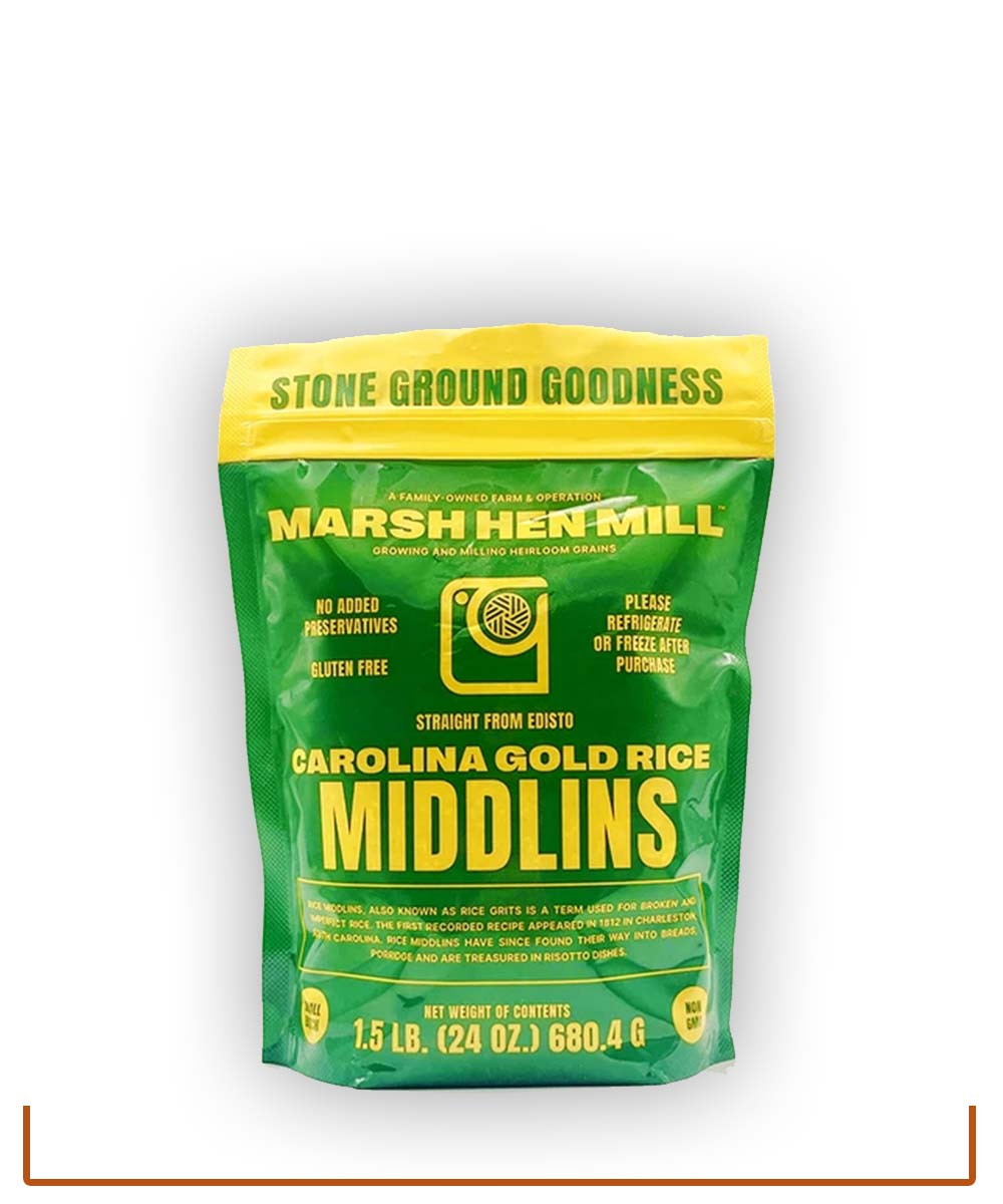 Carolina Gold Rice Middlins, also known as rice grits, are broken and imperfect pieces of rice. They have the same smooth texture as polenta or porridge, but are thicker for sopping up gravy and sauces. Try in breads, porridge and rissoto. To cook use more water than you would for rice, try 4-6 cups of water/1 cup of rice, cook for 15-20 minutes, strain and spread on a pan to cool. 1.5 lb bag