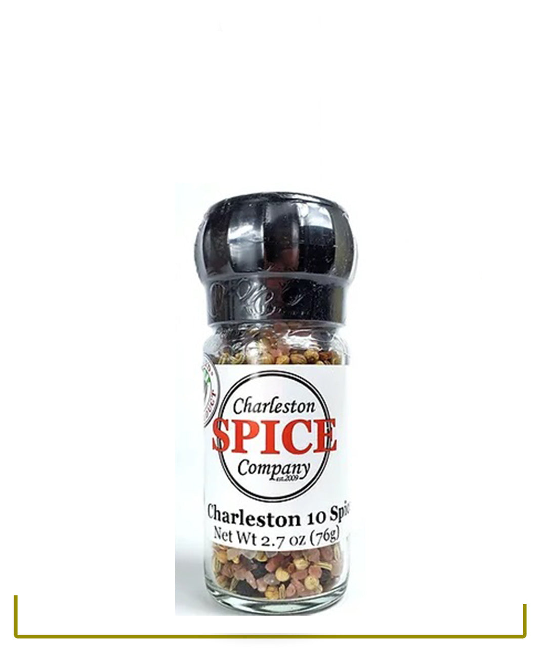 Charleston 10 Spice, a blend of 10 herbs and spices delicious on everything from avocados to zucchini. Also try on fish, chicken and salads. Organic Ingredients: Himalayan pink salt, Tellicherry peppercorn, fennel seed, coriander seed, red chili flakes, oregano, thyme, basil, marjoram, and rosemary. 2.7oz glass grinder.