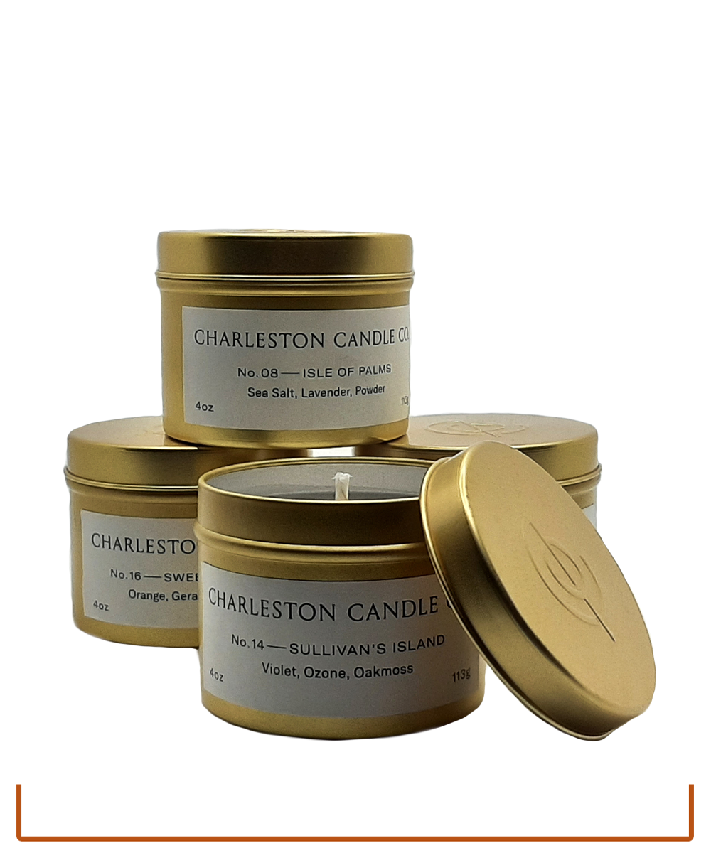 Soy-wax, hand poured gold candle tins handcrafted in Charleston featuring the favorite fragrances of the Lowcountry including, Spanish Moss, Sweetgrass, Jasmine (Church Street), Magnolia, Beachmusk (Folly) and more. Perfect gift items. 4oz