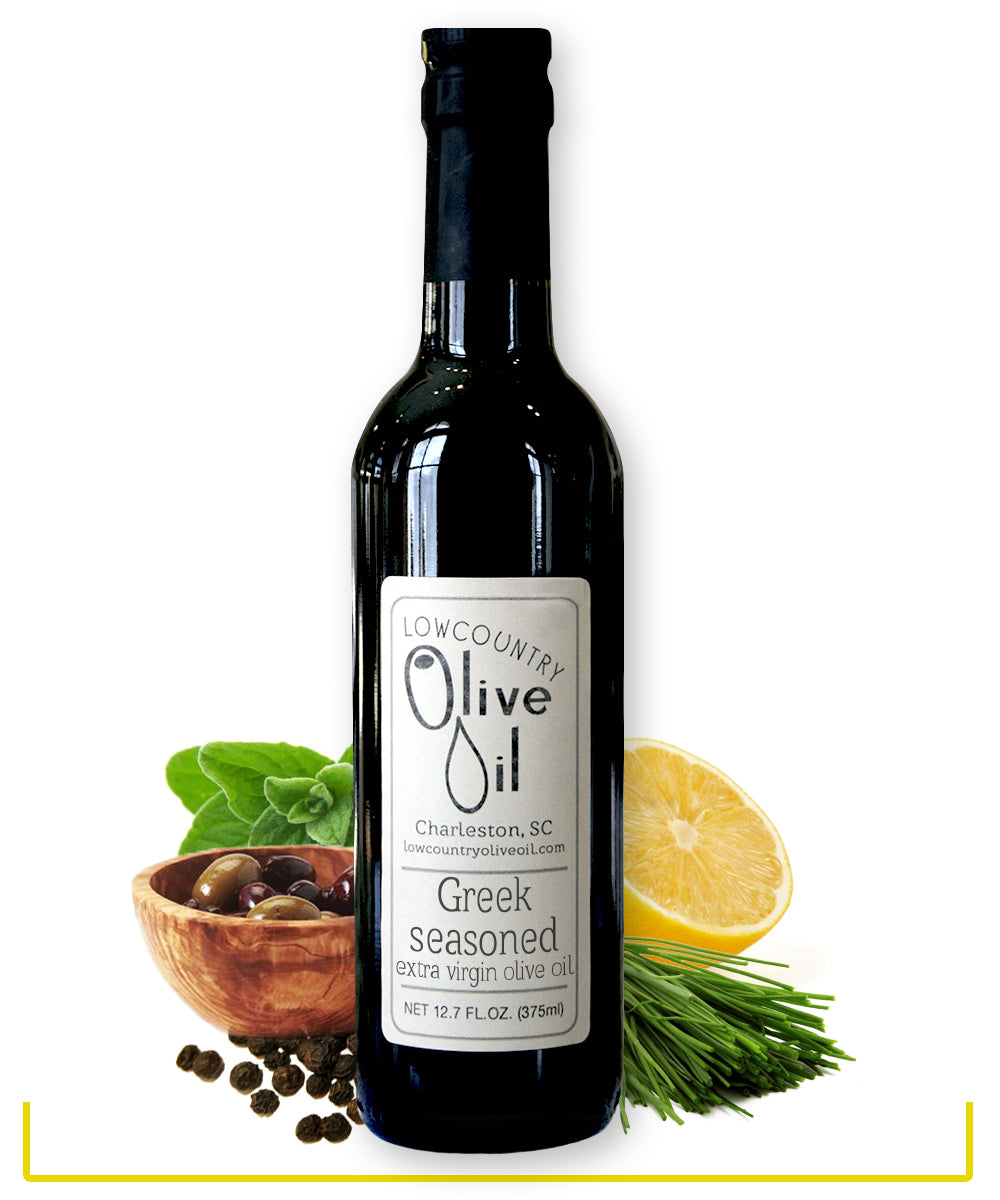 Bold Greek Koroneiki Olive Oil infused with chive, lemon, black pepper and oregano is the perfect addition to fish, chicken, lamb, potatoes and salads. You won't see this in every olive oil shop! 375ml/12.5 oz