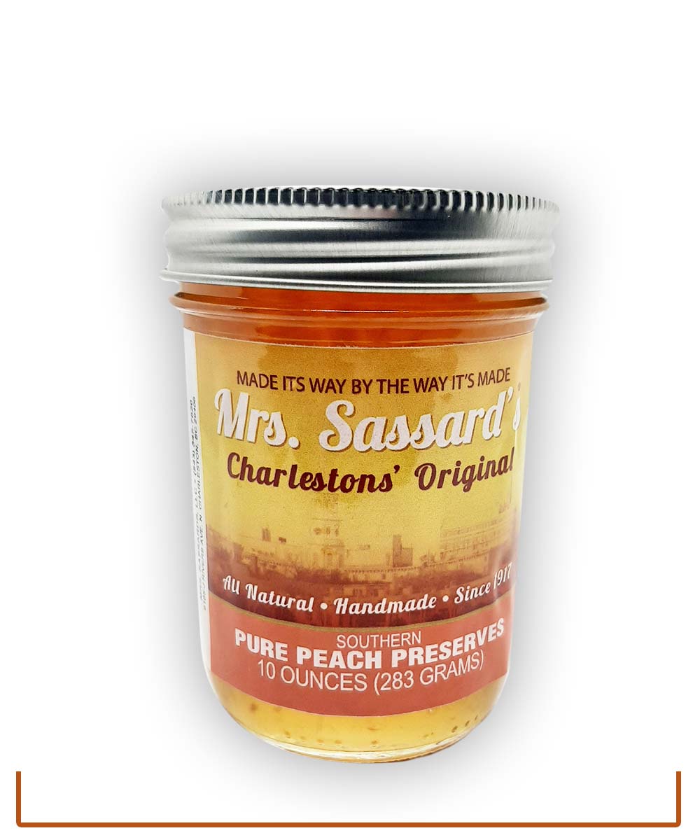 Enjoy fresh South Carolina peaches year-round in these preserves. Use on meats, charcuterie boards, and biscuits. Pair with Callies Biscuit Mix for a perfect Charleston gift. Mrs. Sassard's family recipe dates back to 1917. 10oz