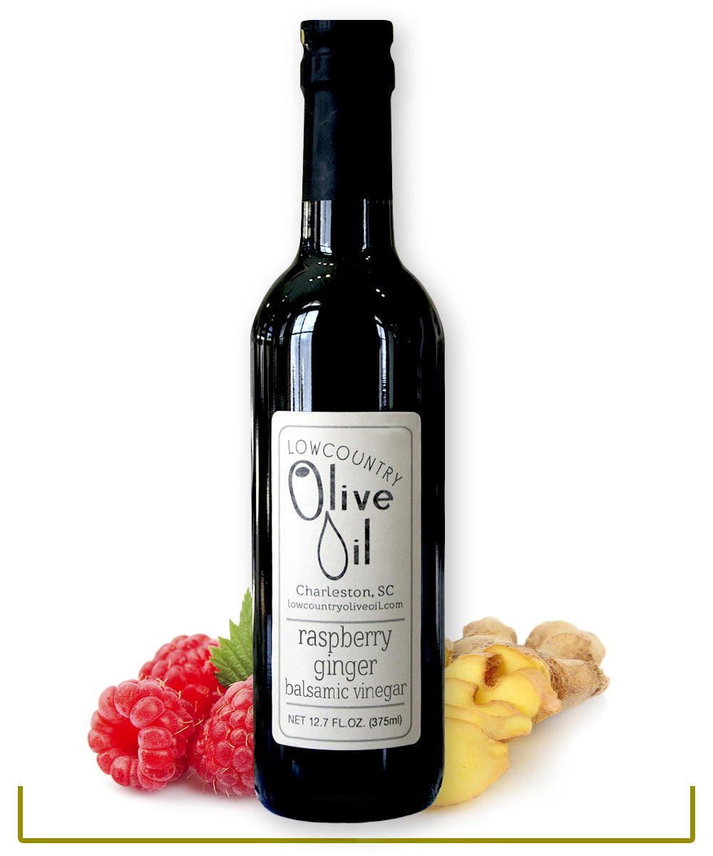 Our dark aged balsamic fused with raspberries and fresh spicy ginger makes a great dressing for Asian dishes and salads. A creation of Lowcountry Olive Oil 375ml/12.7oz