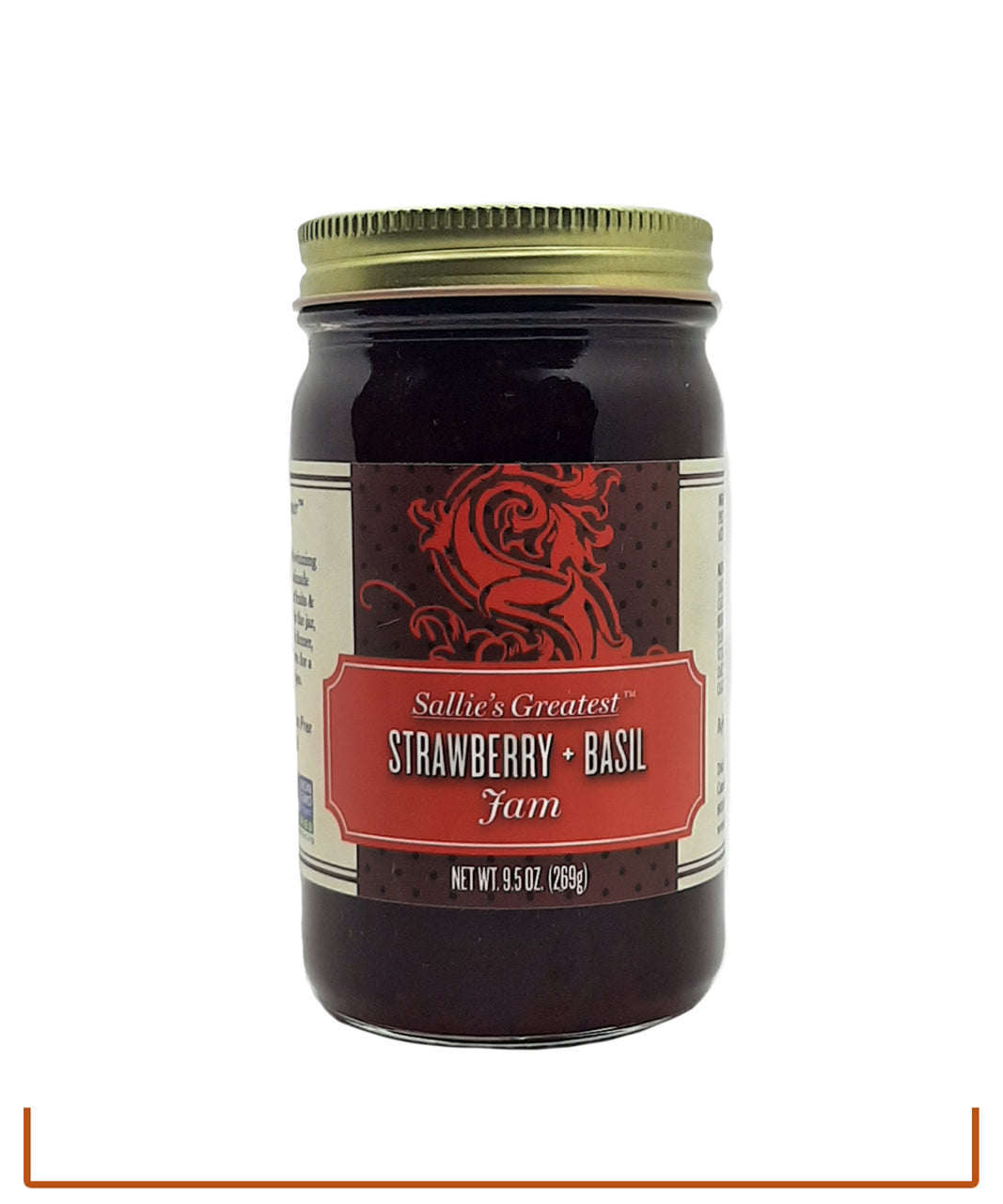 Sallie's Greatest Strawberry Basil jam is delicious over cream cheese, toast, bagels, and panini's. Also pairs well with Callie's Buttermilk Biscuit Mix or Callie's Shortcake Biscuit Mix. 9.5 oz jar.