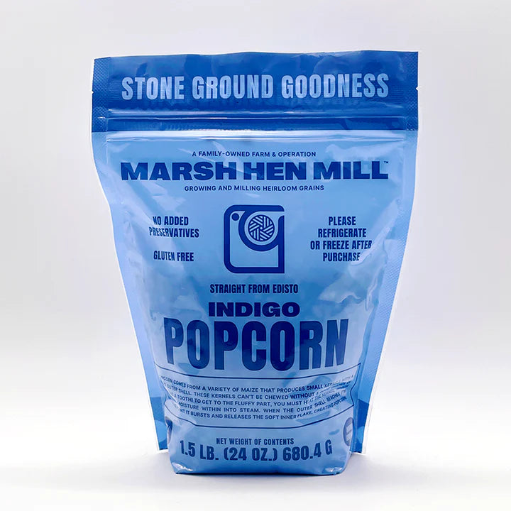 Indigo Popcorn comes from a special variety of maize ("corn") that produces a sweeter, fluffy product than traditional popcorn. Like all corn, the kernel is white on the inside, not blue. Drizzle with our butter flavored olive oil and Charleston sea-salt for the ultimate snack! 1.5 lbs