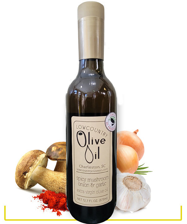 Spicy mushroom olive oil with garlic infused into Greek olive oil with a hint of chipotle peppers. Drizzle over pasta, chicken, rice and potatoes. A Lowcountry Olive Oil original, made exclusively in Charleston. One of our top sellers! 12.7oz (375ml)